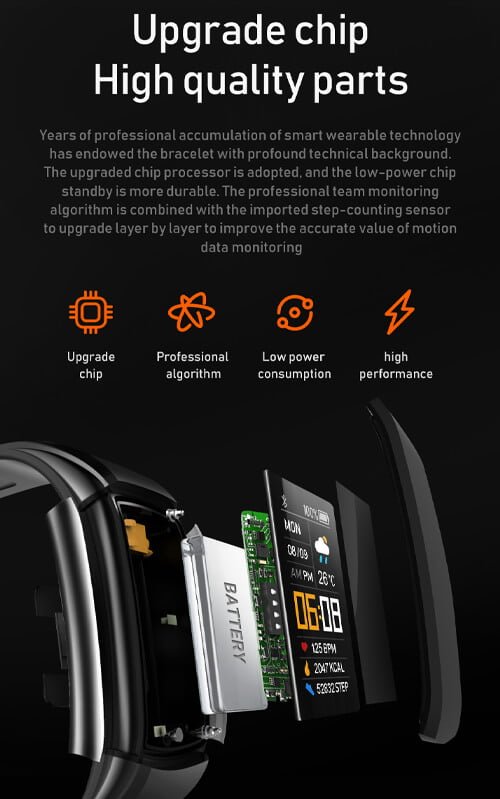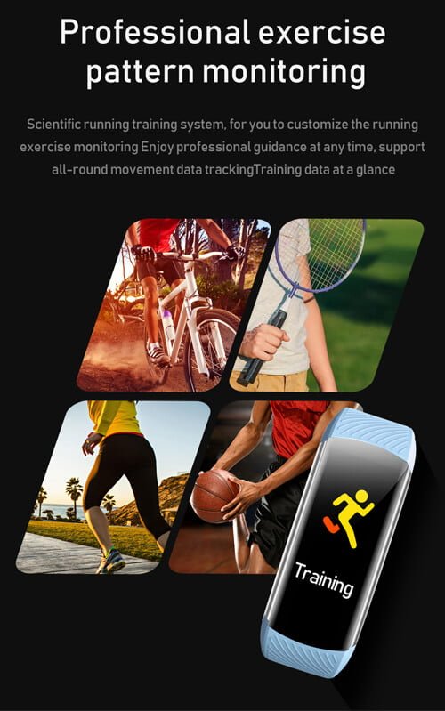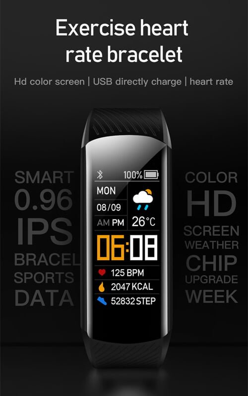 Ten colors to choose from,with functions of weather,time,date,temperature,step,distance,calorie,sleep,target,heart rate,blood pressure,blood oxygen,camera control….