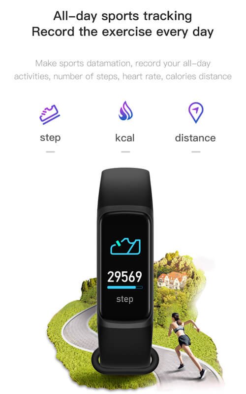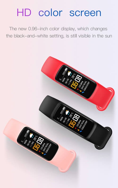 Three colors to choose from,with functions of weather,time,date,temperature,step,distance,calorie,sleep,target,heart rate,blood pressure,blood oxygen,camera control….