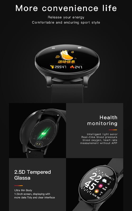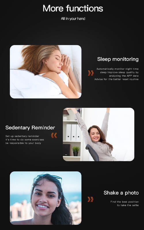 A variety of commonly used smart functions,check the weather,remotely take photos,and SMS reminders sedentary reminders,smart stopwatches,etc… various parctical tools facilitate your daily life.